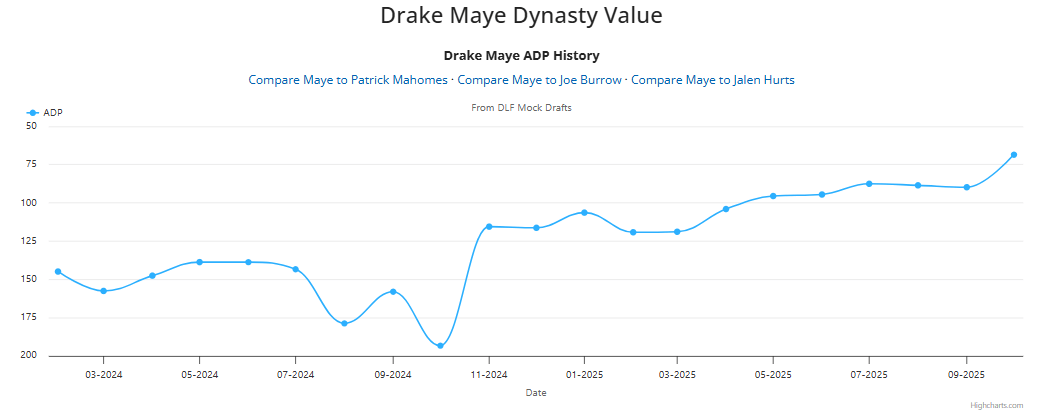 At this time last season, Maye’s ADP hit a career-low at 193.25 overall in one-quarterback leagues. Now, he’s going over 100 picks earlier, jumping up to 68.5 overall off the board. That means he’s the QB6 in dynasty leagues, sandwiched between Patrick Mahomes and Justin Herbert. The DLF Expert Rankings have Maye as the QB7, 67th overall off the board. Joe Burrow is the QB that moves up over Maye in the expert rankings, he’s the QB5 there, but the QB11 in ADP.