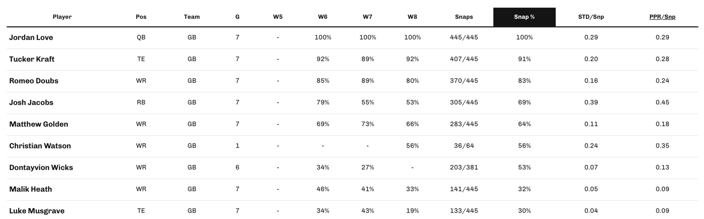 We knew the Green Bay depth chart was going to be messy, and with five pass catchers seeing more than 50% of available snaps, you would think the resultant output would be sporadic and chaotic. Instead, it’s all been a bit orderly – Kraft and Romeo Doubs lead the team in snap percentage, and subsequently targets, yards and touchdowns. After returning from injury it seems like Christian Watson may be ready to make some noise, but it’s unlikely to come at the expense of the team’s top duo.