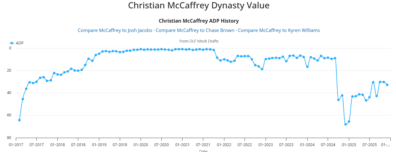 McCaffrey’s dynasty ADP dipped all the way down to 68th overall in December of last year, before rebounding a bit in the off-season. While it’s much higher now at 32.75 overall, it’s still much lower than the top 12 dynasty pick he’s been basically his entire career. In December ADP, he’s the number 11 running back off the board, going behind Omarion Hampton and Bucky Irving, but just ahead of Breece Hall and Chase Brown. Derrick Henry is the next RB in the ADP who is older than CMC, and he’s all the way down at 76 overall, RB24. The expert rankers are higher overall on McCaffrey, placing him at 49th overall off the board, but in the RB rankings he’s down to RB16. Based on those rankings, now seems like a good time to sell this year’s number one overall scoring player.