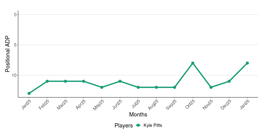 Whatever your take is on Pitts, we hope you got him early last season before he exploded for an extended stretch. The ADP has climbed back up in the top-7 range. With the lack of other options at the position, it’s not a surprise. We are bullish on the still young pass catcher. He certainly cannot get any worse…can he?