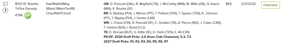 Here’s an example of a $100 SF league with a pretty solid roster, selling for a very nice price of $69 for the first season: