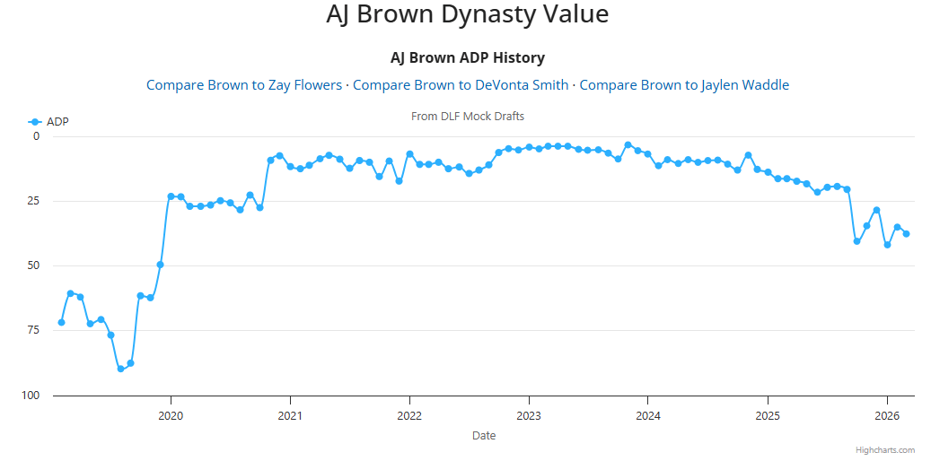 AJ Brown’s Dynasty ADP History, per DLF.